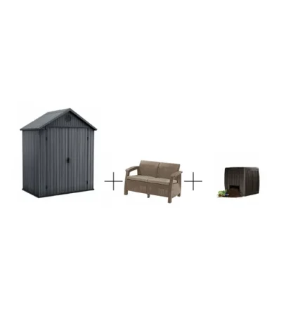 KETER DARWIN 6X4 SZÜRKE MŰANYAG KERTI HÁZ + AJÁNDÉK CORFU 2 ÜLÉSES KANAPÉ ÉS DECO COMPOSTER