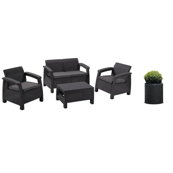 A stílusos Corfu szabadidő bútor szett maximális kényelmet garantál a felhasználók számára. A szettet modern dizájn jellemez, melyet természetes rattan fonás inspirált. A szett stabilitását és kényelmét szolid felépítésének és átgondolt szerkezetének köszönheti. A bútor szett egy kétszemélyes kanapét, két fotelt, egy asztalt és egy virágládát tartalmaz. A bútorok ellenállnak az időjárás viszontagságainak és az UV sugárzásnak.