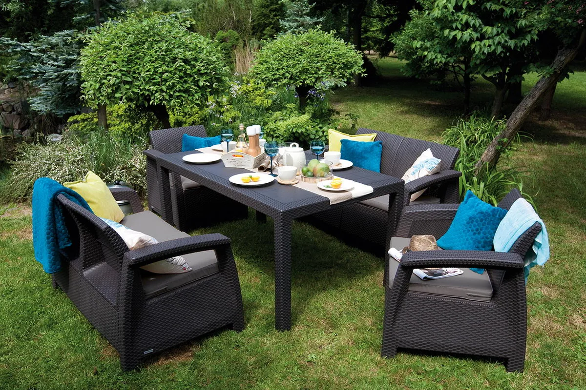 A Corfu Fiesta bútor szett felülete rattant imitáló anyagból készült. A szett két fotelt, két darab kétszemélyes kanapét és egy nagy négyszögletes asztalt tartalmaz, ennek köszönhetően kiválóan alkalmas étkezésekhez is. Tökéletes nagy terek berendezésére, kiváló családi grill- vagy kerti partik rendezéséhez. A bútorok tartósak és ellenállnak az időjárás viszontagságainak, valamint az UV sugárzásnak. A Corfu Fiesta elegáns színárnyalatokban kapható. Összeszerelése könnyű, tisztítása egyszerű.