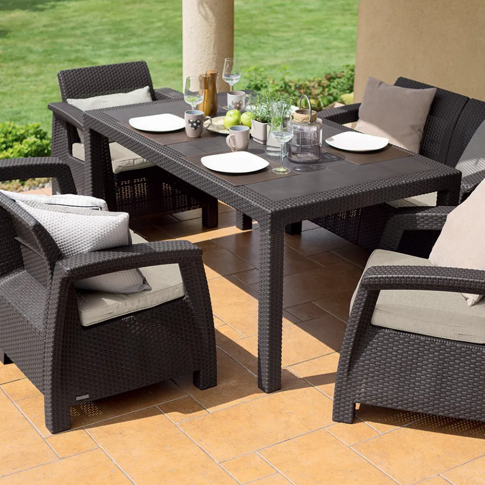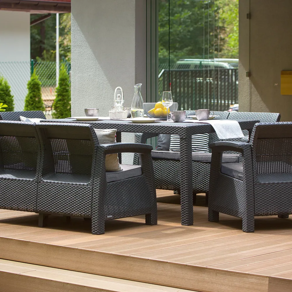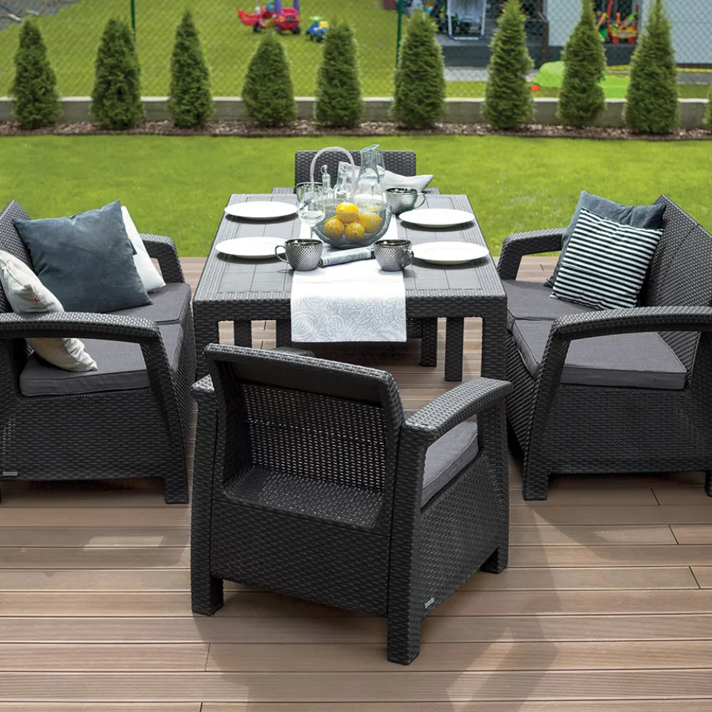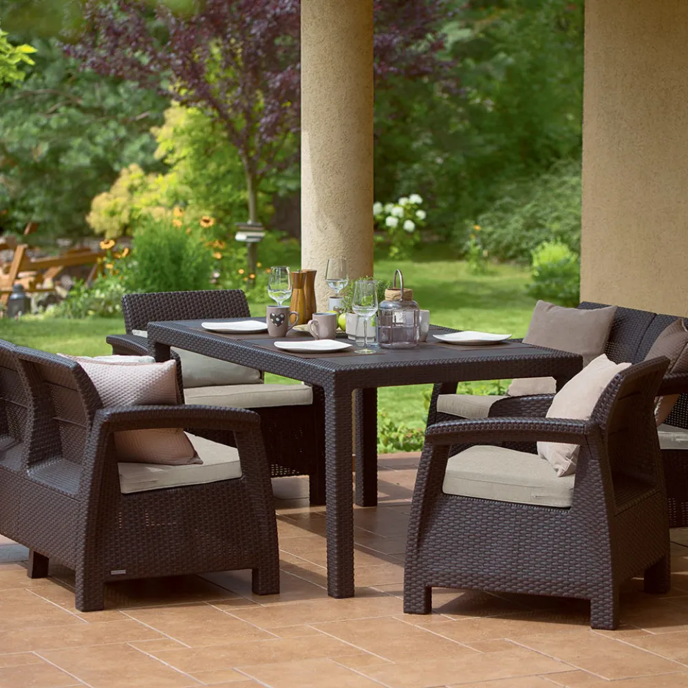 A Corfu Fiesta bútor szett felülete rattant imitáló anyagból készült. A szett két fotelt, két darab kétszemélyes kanapét és egy nagy négyszögletes asztalt tartalmaz, ennek köszönhetően kiválóan alkalmas étkezésekhez is. Tökéletes nagy terek berendezésére, kiváló családi grill- vagy kerti partik rendezéséhez. A bútorok tartósak és ellenállnak az időjárás viszontagságainak, valamint az UV sugárzásnak. A Corfu Fiesta elegáns színárnyalatokban kapható. Összeszerelése könnyű, tisztítása egyszerű.