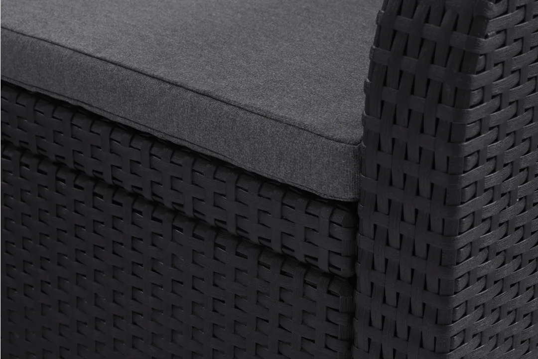 A Georgia rattan hatású bútor szettet két fotel, egy kétszemélyes kanapé és egy négyszögletes asztal alkotja. A bútor szett ideálisan beleillik minden kertbe, ahol ideális helyet teremt a pihenéshez. A termékekhez stílusos, a szetthez passzoló színű puha párnákat mellékelünk. Nagyon egyszerű a tisztításuk. A könnyű és stabil szerkezetű bútorok tisztítása nagyon egyszerű. A szett ellenálló a külső sérülésekkel és az időjárás viszontagságaival, illetve az UV sugárzással szemben is.