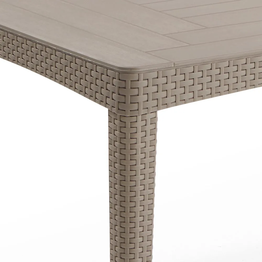 A Girona asztalcsalád azoknak fogja elnyerni a tetszését, akik értékelik a természetes rattanra emlékeztető, lekerekített vagy lapos szövésű mintával díszített bútorok stílusát és eleganciáját. Az asztalt rendkívül könnyű összeszerelni és tisztán tartani. A termék ellenáll a kölső hatások okozta sérüléseknek, a kedvezőtlen időjárási körülmények és az UV-sugarak hosszú távú hatásainak is.