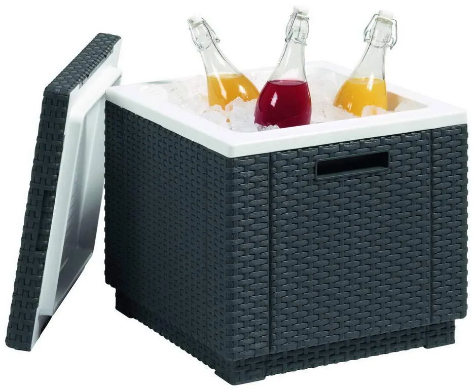Az Ice Cube egy egyszerű formatervezésű, egyedi megjelenésű ülőhely párnával és tároló funkcióval. A termék székként, asztalként és lábtartóként is használható. A klasszikus színek és a rattan hatású felület lehetővé teszik a legigényesebb ügyfelek kielégítését is. A bútor anyaga a nedvességgel és az UV sugárzással szemben ellenálló műanyag, nagyon könnyű a tisztítása.