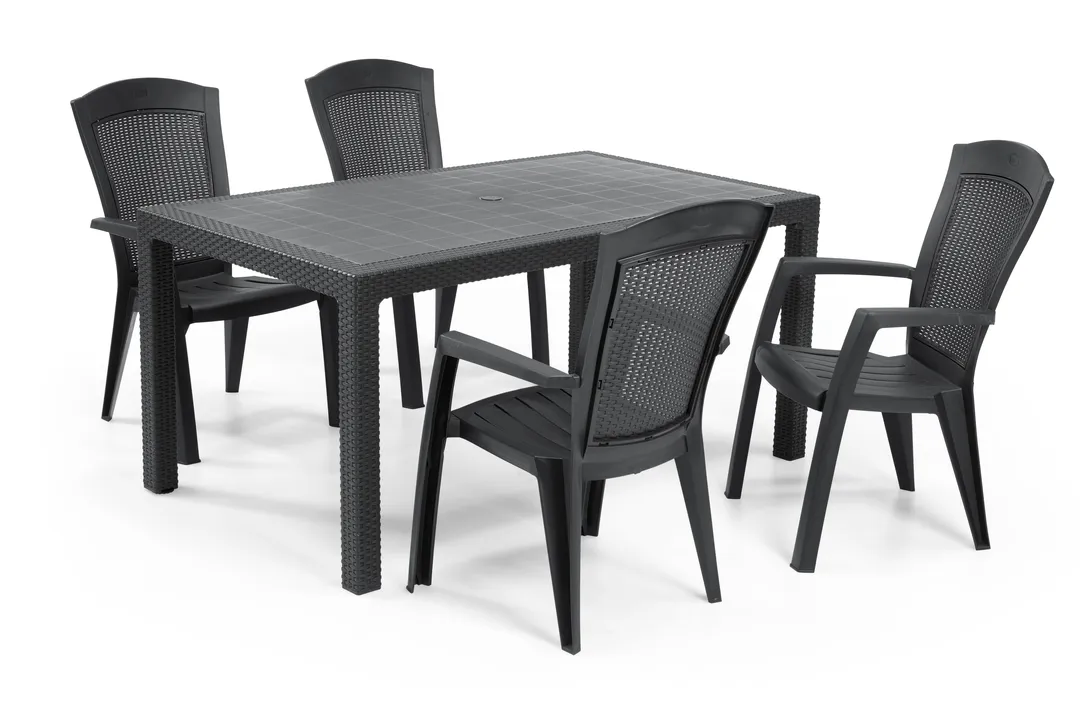 A stílusos és kényelmes Minnesota kartámaszos fotel hangulatosabbá teszi a teraszon, erkélyen vagy a kertben töltött perceket. A természetes rattan fonást imitáló, megfelelő profilú háttámla rendkívüli kényelmet biztosít. Könnyű tisztán tartani, tartós és ellenáll az időjárás viszontagságainak, valamint az UV sugárzásnak. Hagyományos színekben kapható.