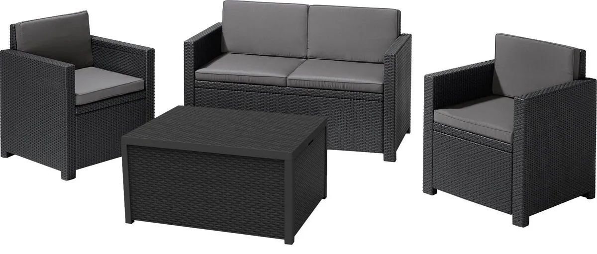 A Monaco egy kényelmes és elegáns kerti bútor szett két fotellel, egy kanapéval és egy tároló funkcióval rendelkező négyszögletes asztallal. A bútorok fő előnyei a rattan hatású felület és a fotelek, valamint a kanapé kényelmes ülőrészei. A tartós anyagból készült bútor ellenáll az időjárás viszontagságainak és az UV sugárzásnak is.