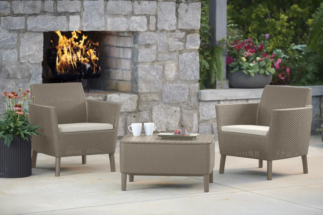 Modern, áramvonalas kialakítás, kényelem és kiváló minőség a Salemo Balcony szett fő előnyei. A garnitúra két széles fotelt és egy tároló funkcióval rendelkező kis asztalt tartalmaz. Természetes rattan fonás inspirálta felülete a termék esztétikai előnyei közé sorolható. A bútorok tisztítása könnyű, a szerelésük nagyon egyszerű és ellenállnak a kedvezőtlen időjárási tényezők hatásának, valamint az UV sugárzásnak.