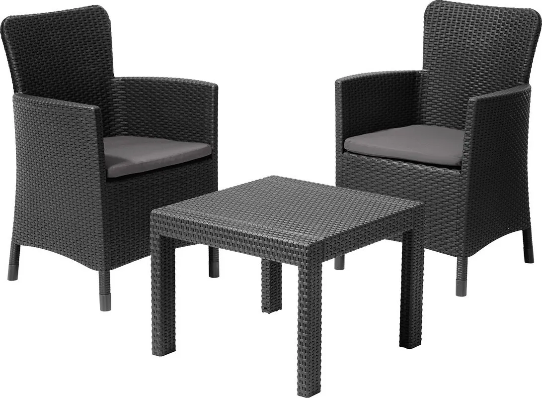 A Salvador egy rattan hatású felülettel rendelkező erkély szett, amely két fotelt és egy négyzet alakú asztalt tartalmaz. A megfelelően profilozott háttámlák és a puha párnák garantálják a kellemes pihenést a szabadban. A bútor szett könnyen tisztítható és ellenáll az időjárás viszontagságainak, valamint az UV sugárzásnak. Klasszikus színválasztékban kapható.