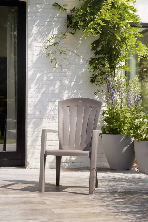 A Santorini egy széles kartámasszal felszerelt, nagyon kényelmes kerti fotel. A terméket könnyű, de egyúttal stabil szerkezet és kiváló tartósság jellemzi. Anyaga ellenáll az időjárás viszontagságainak és az UV-sugaraknak. A széket nagyon könnyű tisztítani, ehhez egyedül egy nedves törlőkendőre van szükség.