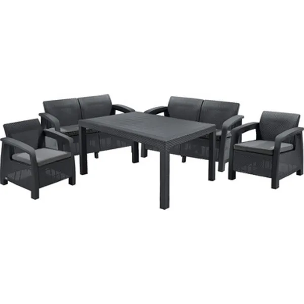 A Bahamas Fiesta bútor szett két fotelt, két darab kétszemélyes kanapét és egy nagy négyszögletes asztalt tartalmaz. A szett kiválóan alkalmas étkezésekhez, tökéletes nagy terek berendezésére, vagy családi grill-, és kerti partik rendezésére. A bútorok tartósak és ellenállnak az időjárás viszontagságainak, valamint az UV sugárzásnak. A Bahamas Fiesta szett elegáns színárnyalatokban kapható. Összeszerelése könnyű, tisztítása egyszerű.