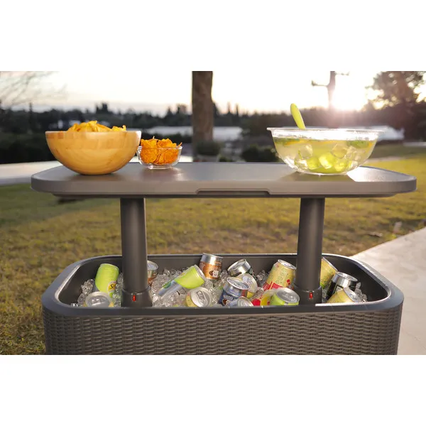 Hogyan hűthetjük le egy családi, vagy egy baráti találkozó forró légkörét a szabadban? Elég néhány perc, hogy elkészítsük a tökéletes helyet az italok és a rágcsálnivalók felszolgálásához. Előnyei a tökéletes funkcionalitás, 2 az 1-ben: italhűtőként, valamint kisebb méretű asztalként is használható. A Bevy Bar tökéletes a szabadban megszervezett családi találkozókhoz vagy egy baráti meccsnézéshez. Könnyű összeszerni és tisztítani, anyagának köszönhetően ellenáll a szélsőséges időjárási körülményeknek és az UV sugárzásnak is.