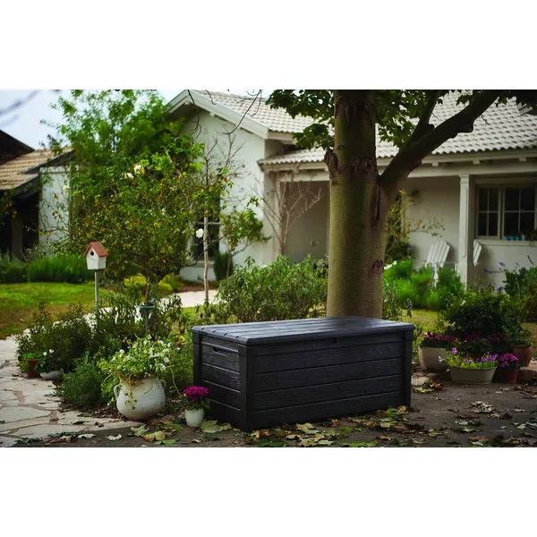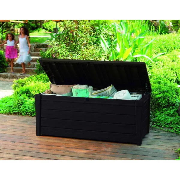 A tágas Brightwood tárolóban minden szükséges kerti szerszám, de még a párnák, plédek, pokrócok és a függőágy is elférnek. A tároló felülete fára hasonlít, ezért a bútor tökéletesen passzol a természetes környezetbe. A kiváló minőségű műanyagból készült termék ellenáll a nedvességnek, szennyeződéseknek és az UV sugárzásnak. A fedél nyitását segítő mechanizmus a termék további előnyét képezi. Tartósságának és masszív kialakításának köszönhetően a tároló ülőhelyként is szolgálhat 2 személy számára.
