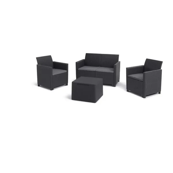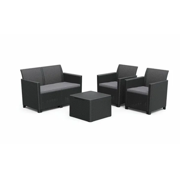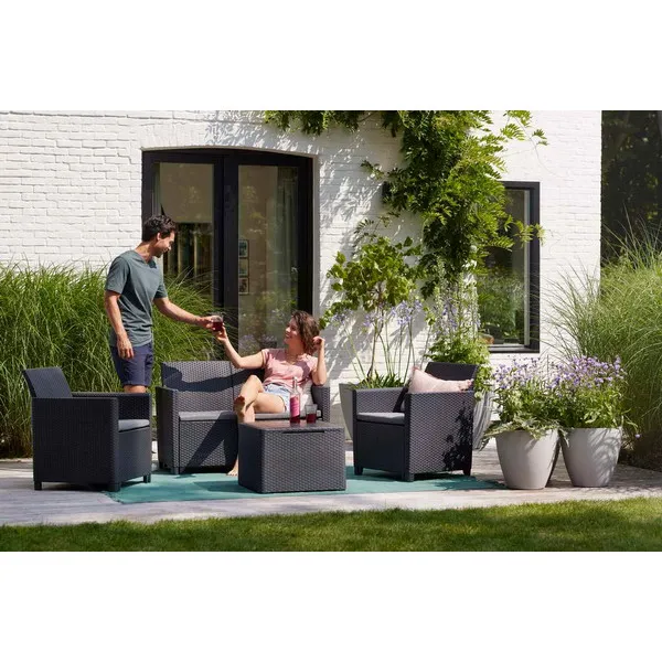 Alakítsd át a teraszod, erkélyed vagy kerted a Keter kényelmes Claire bútor szettjével. A szetthez mellékelt párnák extra kényelmet nyújtanak a kikapcsolódás pillanataiban. Az éppen nem használt a párnák a tárolási funkcióval rendelkező asztal belsejében tarthatók. A Claire szabadidő szett minden igényt kielégít, így a szabadban bárhol elhelyezve képes megfelelő kényelmet nyújtani. A termékek fenntartható, karbantartást nem igénylő, időjárásálló anyagokból készültek. Szerszámok használata nélkül összeszerelhetők, így a bútorok már 20 perccel az összerakás megkezdése után használhatók! Opcióként klasszikus Orlando, vagy tároló funkcióval rendelkező asztallal is kapható.