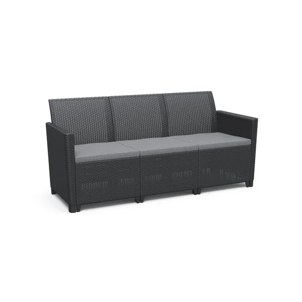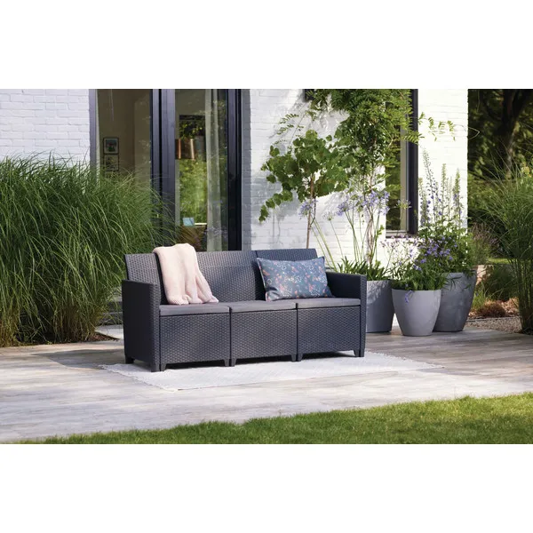 Alakítsd át a teraszod, erkélyed vagy kerted a Keter kényelmes Claire kanapéja segítségével. A termékhez mellékelt párnák biztosítják a kényelmes pihenést. Minden Claire kerti bútor szett a kültéri terek igényeihez igazított kényelmet biztosít, anélkül, hogy bármilyen minőségi változást okozna. A bútorok fenntartható, karbantartásmentes és időjárásálló anyagokból készültek. Kombináld ezt a 3-személyes kanapét további Claire fotelekkel és egy opcionális asztallal a saját ülőgarnitúrád megalkotásához!