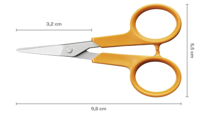 A hegyes és éles olló pontosan vágja el a hímzõfonalat és a hímzett kelmét. Jobb- és balkezesek egyaránt használhatják. Pengehossz: 3,2 cm. (FISKARS 859807, 1005143)