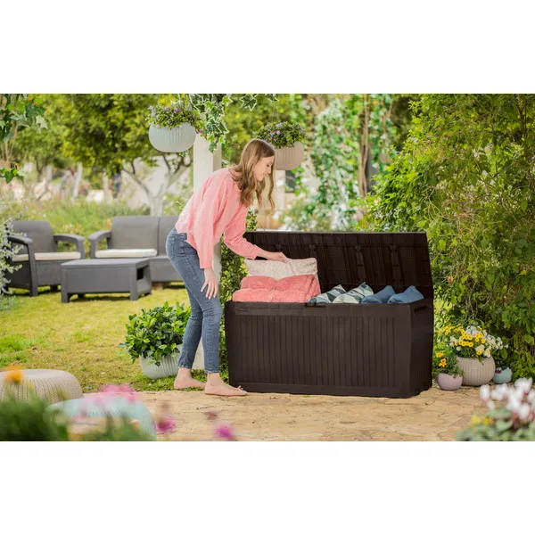 A Comfy 270L-es tárolóval mind a munka, mind a pihenés kényelmesebbé válik a kertben. A tárolónak köszönhetően minden kerti szerszám kézközelben lesz. A hagyományos formatervezés és az univerzális kinézet is hozzájárul, hogy a tároló tökéletesen mutat bármely kertben. A termék további előnyét képezik a felszerelhető görgők, amelyek még a legjobban megpakolt ládák mozgatását is jelentősen megkönnyítik.