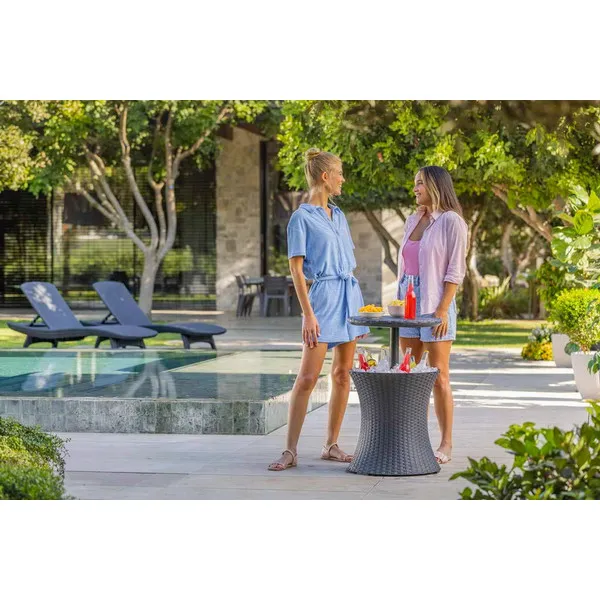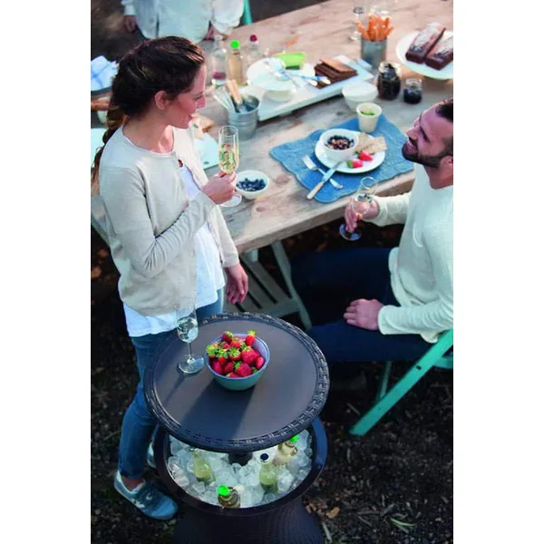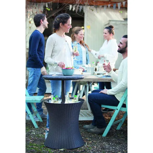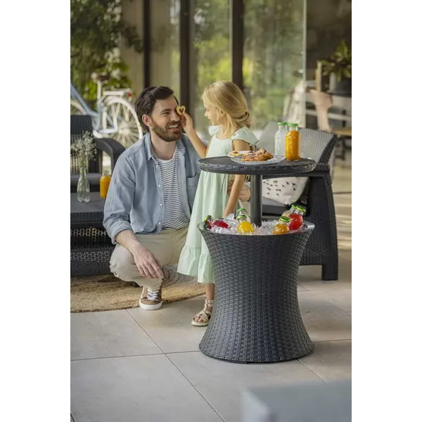Funkcionális kerti italtartó asztal. Összecsukva kézreálló dohányzóasztal, szétnyitva klasszikus bárasztal italhűtő tárolóval. Az elegáns dizájn, a fonott rattant imitáló kivitelezés és a funkcionalitás azt eredményezi, hogy a Rattan Cool Bar nagy segítségünkre válik a kerti baráti vagy családi összejövetelek során.