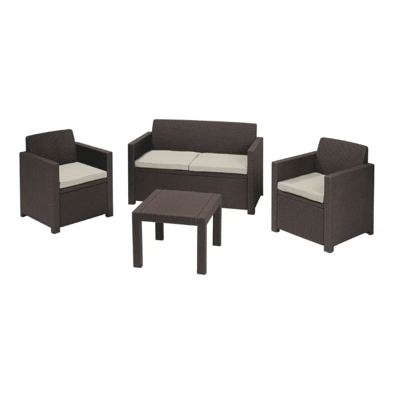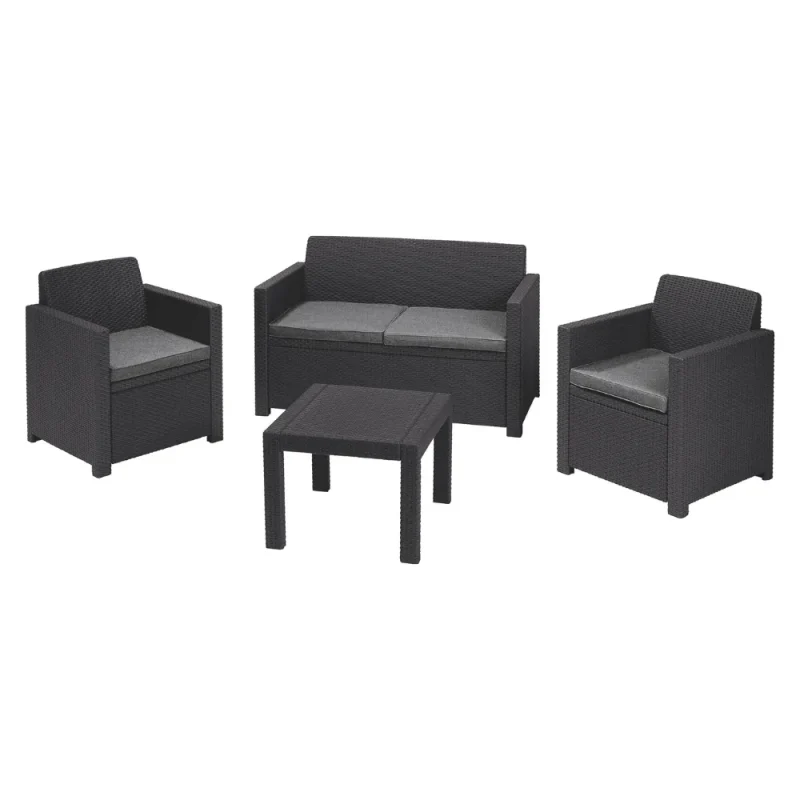 - Kényelmes és praktikus : Az ergonomikus kialakítás és a párnázott ülőfelületek maximális komfortot nyújtanak, míg a tárolóasztal praktikus megoldást kínál a kerti kiegészítők elrejtésére.