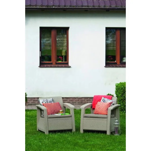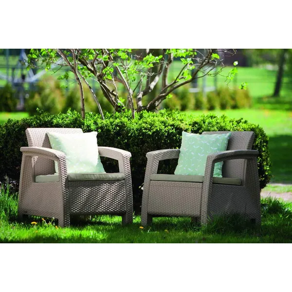 Elegancia és magas minőség dupla kivitelben. Két komfortos fotel puha párnákkal, melyek használhatók kisebb terek komplett berendezésére vagy kiegészítő elemként is. A Corfu Duo tökéletesen passzol a márkavonal kanapéihoz és asztalaihoz. Ennek köszönhetően szabadon módosítható a szett a saját igényektől és az adott tér berendezési lehetőségeitől függően.