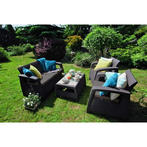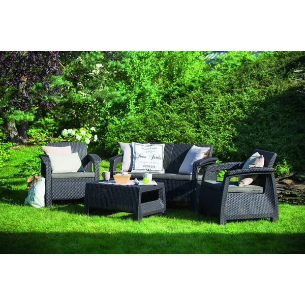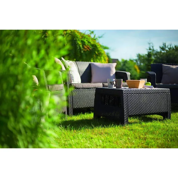 A stílusos Corfu szabadidő bútor szett maximális kényelmet garantál a felhasználók számára. A szettet modern dizájn jellemzi, melyet fonott rattan inspirált. A szett stabilitását és kényelmét erős felépítésének és átgondolt szerkezetének köszönheti. A bútor szett egy kétszemélyes kanapét, két fotelt és egy asztalt tartalmaz. A Corfu termékvonal – kényelmes párnákkal – háromféle színben kapható. A bútorok ellenállnak az időjárás viszontagságainak és az UV sugárzásnak.