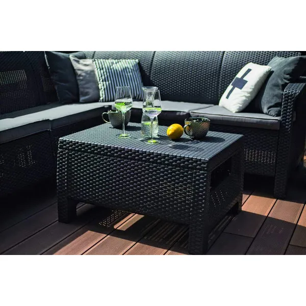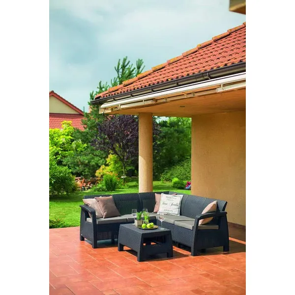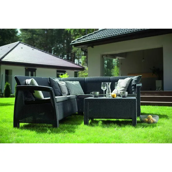 Elegancia és funkcionalitás egyben! A legmagasabb precizitással készült, kényelmes kanapéból és stílusos asztalból álló Corfu Relax sarokbútor szett maximális kényelmet biztosít a felhasználó számára. A könnyű, de stabil szerkezetű bútor magas minőségű, az időjárás viszontagságainak ellenálló műanyagból készült. A természetes rattan hatású felület, a profilozott ülőhelyek és a puha párnák minden kétséget kizáróan a termék további előnyeit képezik.