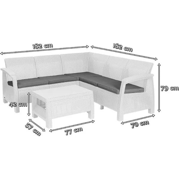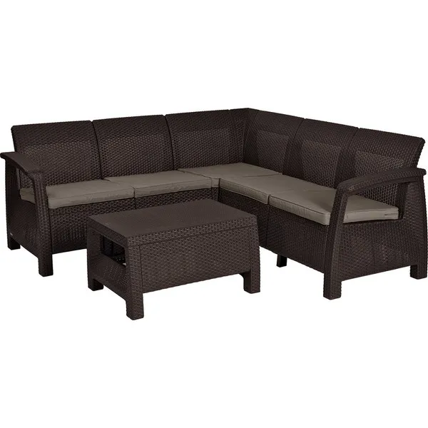 <p>Elegancia és funkcionalitás egyben! A legmagasabb precizitással készült, kényelmes kanapéból és stílusos asztalból álló Corfu Relax sarokbútor szett maximális kényelmet biztosít a felhasználó számára. A könnyű, de stabil szerkezetű bútor magas minőségű, az időjárás viszontagságainak ellenálló műanyagból készült. A természetes rattan hatású felület, a profilozott ülőhelyek és a puha párnák minden kétséget kizáróan a termék további előnyeit képezik.