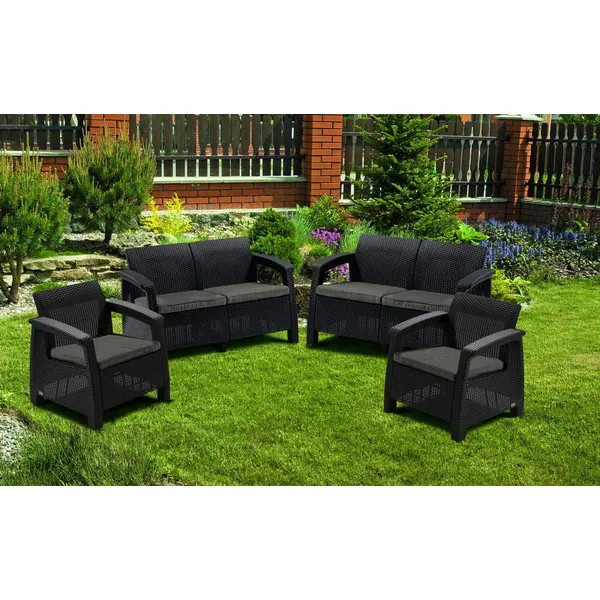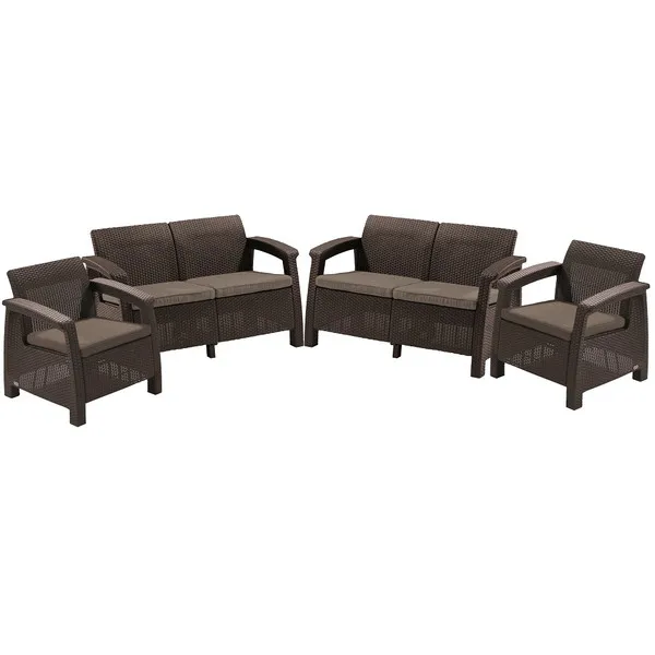 A Corfu Rest egy nádfonású textúrára emlékeztető kerti bútor szett, amely kettő fotelből és kettő kétszemélyes kanapéból áll. Tökéletes nagyobb terek stílusos berendezéséhez. A bútorok jellemzője a tartósság és a kedvezőtlen időjárási viszonyoknak, valamint az UV sugárzásnak való ellenállás. A Corfu Rest elegáns színpalettában kapható, könnyen összeszerelhető és tisztítható.