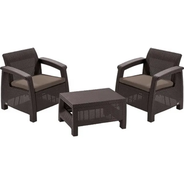 Szépség és elegancia egy szettben. A bútorok formája és a szett optimális mérete lehetővé teszi kisebb kertek és erkélyek berendezését is. A szett egy asztalt és két puha párnával rendelkező fotelt tartalmaz. A termék eleganciája, kényelme és a vonalvezetése garantálja a kellemes pihenést a szabad levegőn. A bútorok további előnye az egyszerű összeszerelhetőség és a könnyű tisztán tartás.
