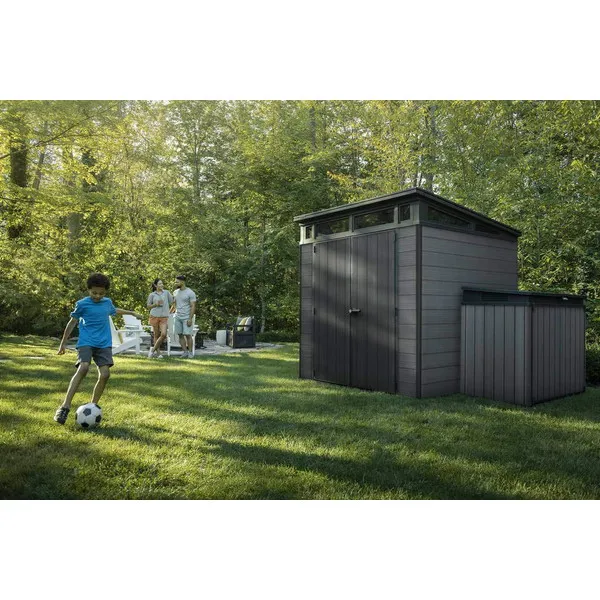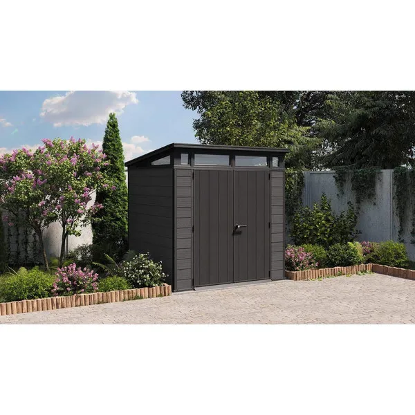 A CORTINA 7×7 szerszámos ház a modern dizájn és a funkcionalitás tökéletes egyensúlyát kínálja. Az egyoldalas tető, a három oldalon beépített tetőablakok és a letisztult, kétszárnyú ajtó kiemelik a ház eredeti és korszerű jellegét. Az innovatív EVOTECH™ kompozit anyagból készült kétrétegű falak rendkívüli tartósságot biztosítanak, miközben a felület textúrája megtévesztően hasonlít a természetes faanyagra, így elegáns megjelenést kölcsönöz a kertednek.