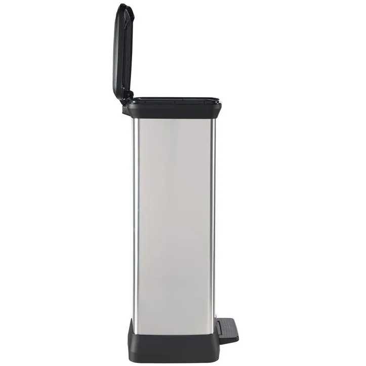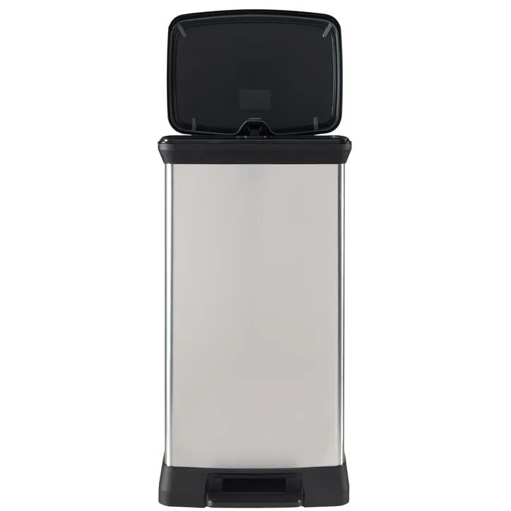 Az 50L-es Deco Bin pedálos szemetes tökéletes választás mindenkinek, aki értékeli a funkcionalitást és az eleganciát. Az oldalfalai fémhatású IML fóliával vannak bevonva, amely modern és stílusos külsőt kölcsönöz neki. A felülete ennek köszönhetően rozsda- és ujjlenyomatmentes marad, így növelve az élettartamot. Az erős, de egyben kényelmes pedál segítségével a fedél egyszerűen nyitható, a szemetesben található gyűrű pedig a helyén tartja a zsákot. A finom záródást biztosító mechanizmusnak köszönhetően a fedél halkan csukódik, a szemetes anyaga pedig egyszerűen tisztítható. A termék 80%-ban újrahasznosított műanyagból készül, amely környezetberáttá teszi. Mindenki számára ideális választás, aki értékeli az esztétikus kinézetet és a funkcionalitást.