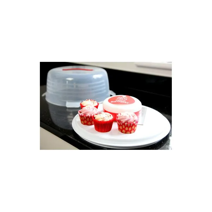 A tortabúra a tökéletes megoldás bármilyen sütemény tárolására és szállítására, legyen szó akár tortákról, muffinokról, vagy sütemény szeletekről. Kényelmes fogantyúval és biztonságos záródással rendelkezik, ennek köszönhetően szállítás közben nem fognak kiesni belőle a sütemények. Teteje levehető, így süteményes tálcaként is funkcionál a termék.
