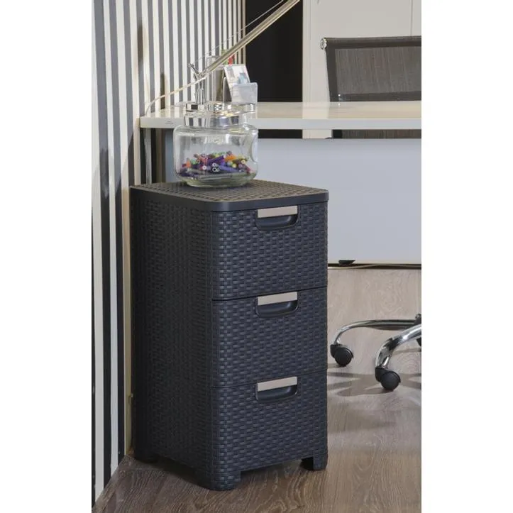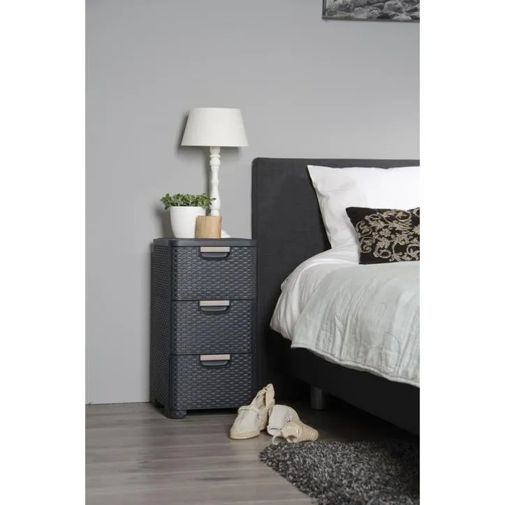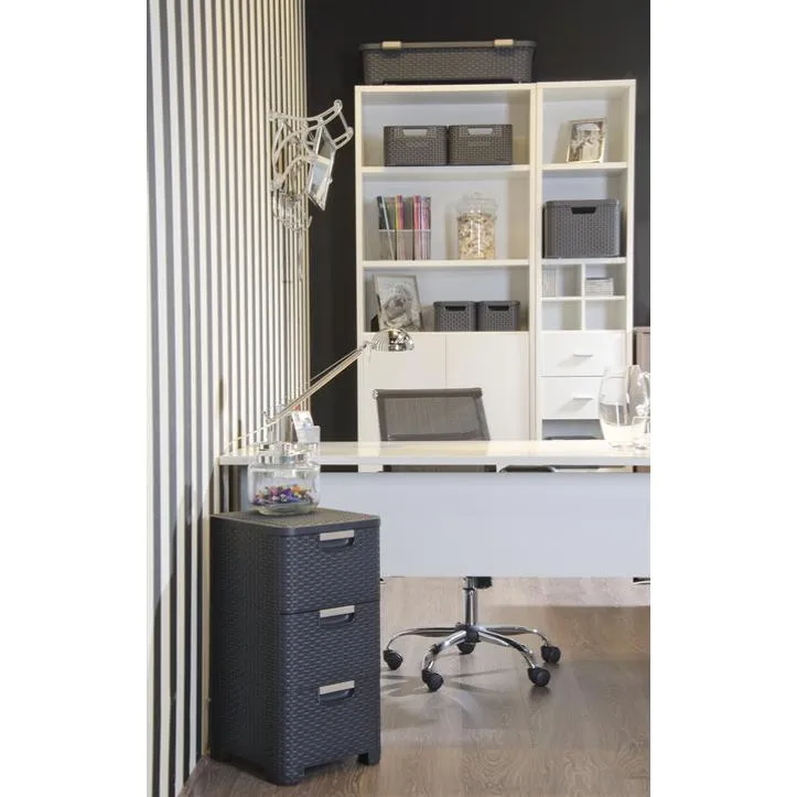 A Style 3 fiókos szekrény elengedhetetlen kiegészítő minden otthonba! Elegáns, rattan hatású textúrájának köszönhetően egyedi a megjelenése, tökéletes megoldás magazinok, könyvek, irodai-, vagy fürdőszobai kiegészítők tárolására. Mindegyik fiók 14L űrtartalmú, kézreálló fogantyúi segítségével könnyedén kihúzhatók, ebben a beépített görgők is segítséget nyújtanak. A szekrény stabilitását 4 láb biztosítja.