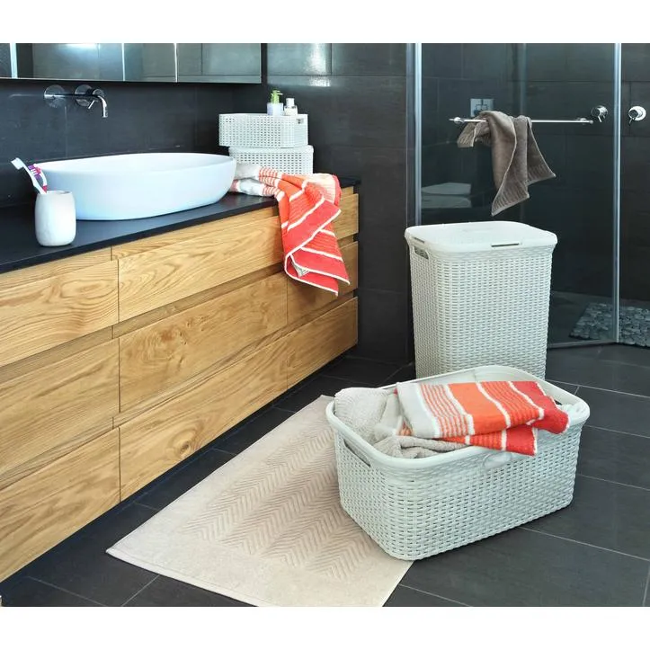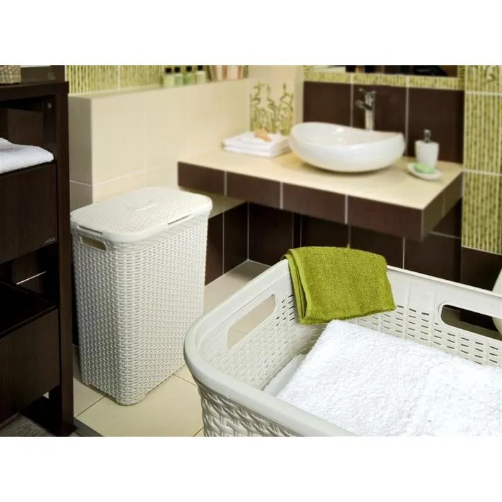 A Curver Style 45 literes szennyeskosara büszkén foglal helyet bármely fürdőszobában, hálószobában, vagy mosókonyhában, miközben praktikus és strapabíró. Fonott rattan stílusú kialakítással rendelkezik, amely biztosítja a jó szellőzést. Négy kényelmes fogantyúval rendelkezik, így különböző hordozási lehetőségeket kínál, hogy a mosás napja ne legyen olyan nagy terhet jelentő feladat. Mivel műanyagból készült, a kosár nemcsak tartós, hanem alacsony karbantartási igényű és könnyen tisztítható is. Ez a kosár nemcsak szép, hanem fenntartható is, mivel legalább 70%-ban újrahasznosított anyagból készült.