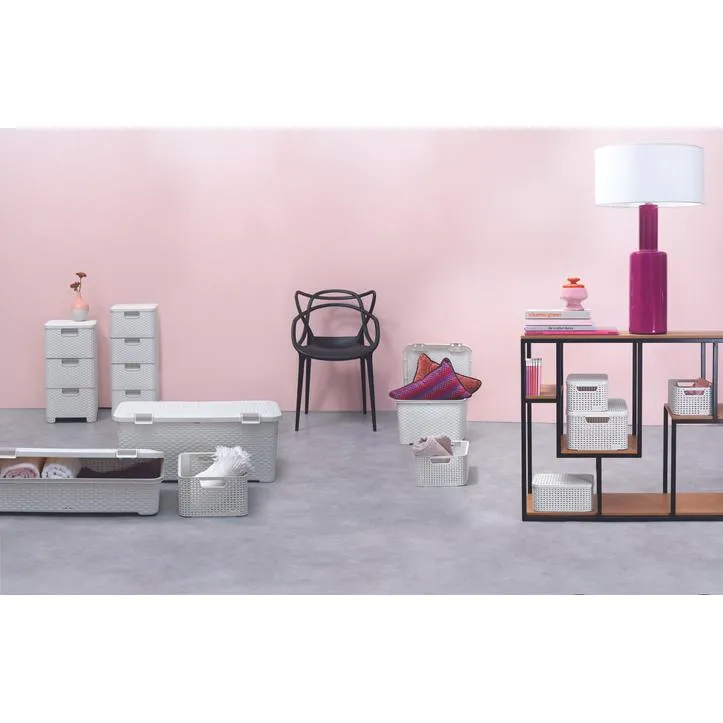 A Style termékcsalád S-es méretű, tetővel is rendelkező kosara egy univerzális tárolási megoldás, amely használható a nappaliban, konyhában, fürdőszobában, vagy a hálószobában is. Tökéletes megoldás kisebb termékek tárolására, például kulcsoknak, távirányítóknak, kozmetikumoknak, fűszereknek, vagy akár gyógyszereknek is. Textúrája rattan szövést imitál, amely exkluzív kinézetet kölcsönöz neki, így bármely belső térben szépen mutat. A termék rendelkezik tetővel is, amely megvédi a benne tárolt tárgyakat a portól, kényelmes fogantyúinak köszönhetően pedig könnyedén szállítható. A kosarak egymásra tehetők, így helytakarékosan tárolhatók. További előnye, hogy legalább 70%-ban újrahasznosított anyagból készül, ennek köszönhetően rendkívül környezetbarát.
