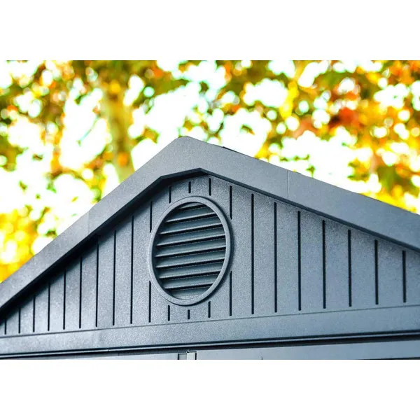 A biztonság érdekében a ház zárral felszerelt, így a benne tárolt tárgyak mindig védve vannak. A szélesre nyíló, kétszárnyú ajtók megkönnyítik a hozzáférést, így a kerti eszközök és egyéb tárgyak behelyezése és kivétele egyszerűen megoldható. A magas tető lehetővé teszi, hogy a felnőttek kényelmesen mozoghassanak a ház belsejében, míg a szellőzőrendszer biztosítja a folyamatos légáramlást, frissen tartva a belső teret. A beépített ablak természetes fényt enged be, így világos és kellemes környezetet biztosít.