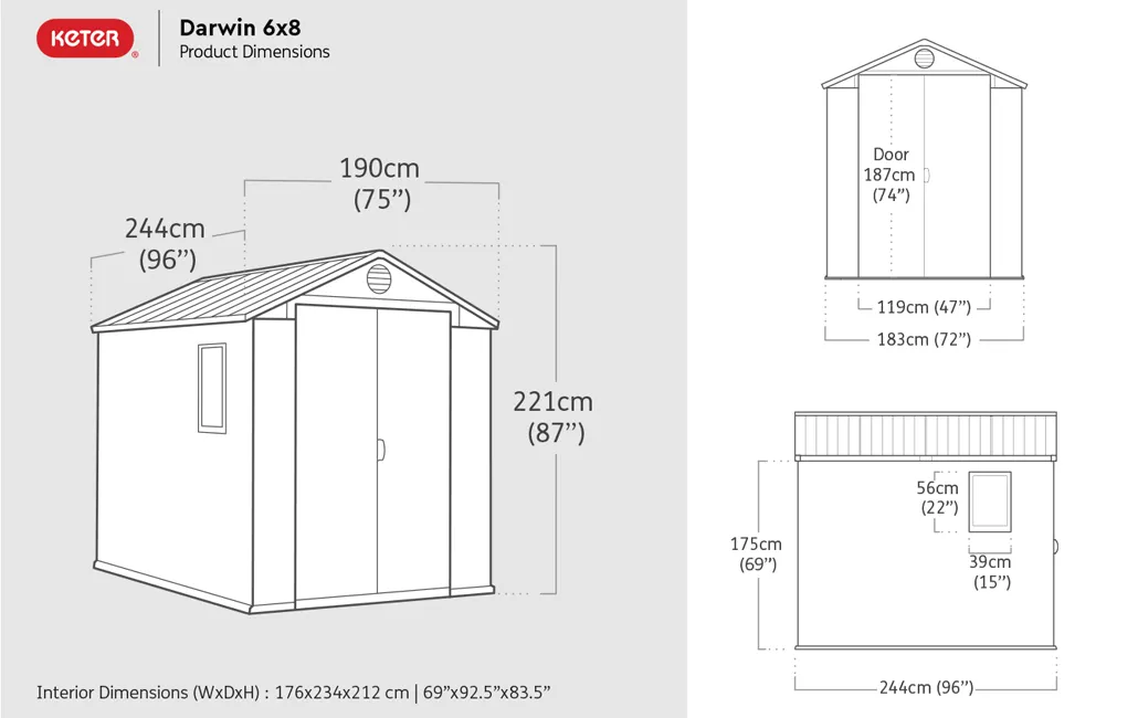 A DARWIN 6×8 MŰANYAG KERTI HÁZ tökéletes választás, ha nagyobb tárolóhelyre van szükséged a kertben. Ez a tartós műanyagból készült kerti ház megvédi a kerti eszközöket, bútorokat vagy sportfelszereléseket az időjárás viszontagságától, ezért a modern megjelenésével is feldobja a kültéri környezetet.
