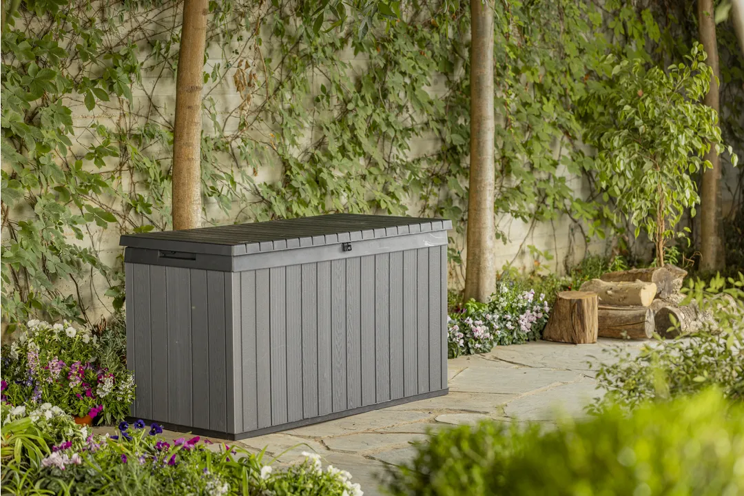 A Darwin kerti tároló az erős kialakítást ötvözi az elegáns megjelenéssel. Innovatív EVOTECH™ alapanyagból készül, amely ellenáll az időjárási viszontagságoknak és az UV-sugárzásnak. A fához hasonló rusztikus textúra és a stílusos, kétszínű keret fokozza a termék esztétikai előnyeit. Jelentős tároló kapacitásának köszönhetően kényelmesen elférnek benne a kültéri párnák és egyéb kiegészítők, így a terasz, az udvar, vagy a kert mindig rendben tartható. A fedélnyitást megkönnyítő mechanizmus a termék vitathatatlan előnye, fedele zárható. trapabíró kialakításának köszönhetően a tároló láda két személy ülőhelyeként is használható. Három méretben kapható: 380L, 570L, 622L.