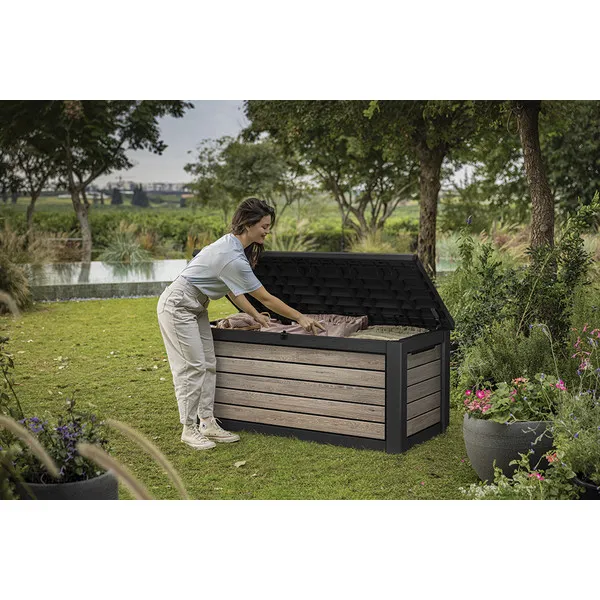 A kényelmes dugattyús rendszer zökkenőmentes nyitást és zárást biztosít, míg a zárható kialakítás garantálja a benne tárolt értékek biztonságát. A 630 literes belső tér bőséges helyet kínál kerti párnák, kiegészítők vagy egyéb tárgyak tárolására, hogy kerted mindig rendezett legyen. Az innovatív DecoCoat™ anyag famintás dizájnja eleganciát és természetes hatást kölcsönöz, miközben megakadályozza a rozsdásodást, fakulást vagy hámlást. Ráadásul a láda kényelmes ülőalkalmatosságként is szolgálhat, így nemcsak praktikus, hanem stílusos kiegészítője is a kertednek.