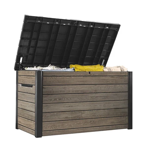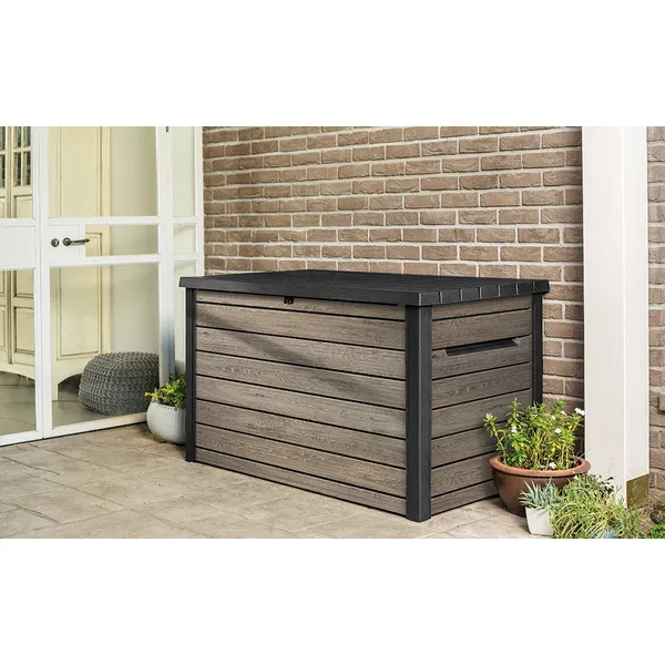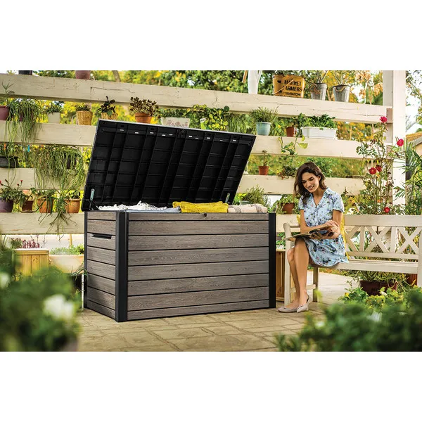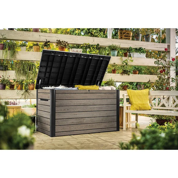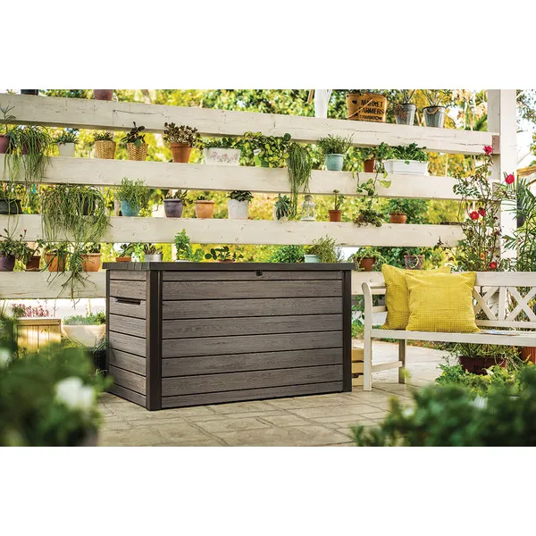 A kényelmes dugattyús rendszer zökkenőmentes nyitást és zárást biztosít, míg a zárható kialakítás garantálja a benne tárolt értékek biztonságát. A 870 literes belső tér bőséges helyet kínál kerti párnák, kiegészítők vagy egyéb tárgyak tárolására, hogy kerted mindig rendezett legyen. Az innovatív DecoCoat™ anyag famintás dizájnja eleganciát és természetes hatást kölcsönöz, miközben megakadályozza a rozsdásodást, fakulást vagy hámlást. Ráadásul a láda kényelmes ülőalkalmatosságként is szolgálhat, így nemcsak praktikus, hanem stílusos kiegészítője is a kertednek.