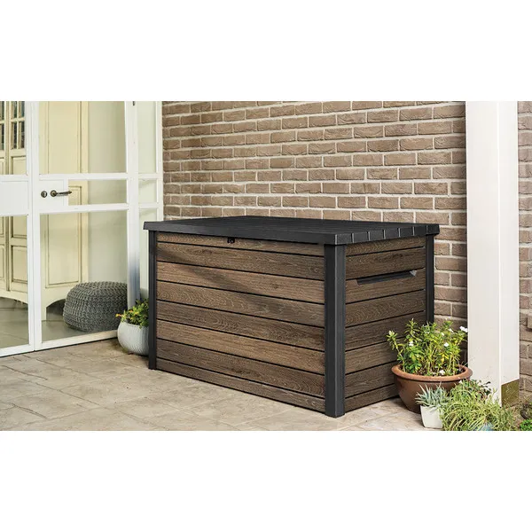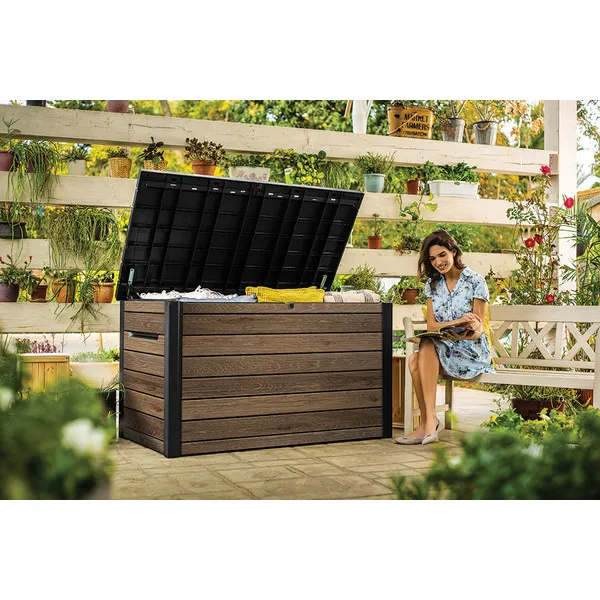 A kényelmes dugattyús rendszer zökkenőmentes nyitást és zárást biztosít, míg a zárható kialakítás garantálja a benne tárolt értékek biztonságát. A 870 literes belső tér bőséges helyet kínál kerti párnák, kiegészítők vagy egyéb tárgyak tárolására, hogy kerted mindig rendezett legyen. Az innovatív DecoCoat™ anyag famintás dizájnja eleganciát és természetes hatást kölcsönöz, miközben megakadályozza a rozsdásodást, fakulást vagy hámlást. Ráadásul a láda kényelmes ülőalkalmatosságként is szolgálhat, így nemcsak praktikus, hanem stílusos kiegészítője is a kertednek.