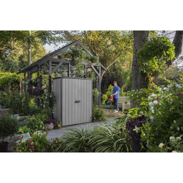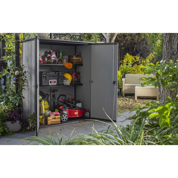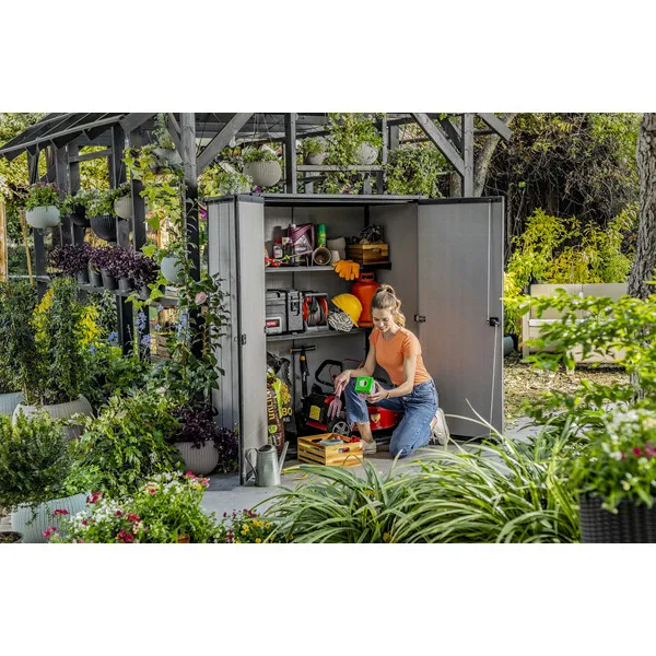 A Duotech High Store Plus egy tartós és univerzális kerti tároló. A széles, kétszárnyú ajtó kényelmes hozzáférést biztosít a tároló belsejéhez, a döntött küszöb megkönnyíti a nehéz tárgyak mozgatását, a tartós padlólap pedig megvédi a tárolóban elhelyezett tárgyakat a kosztól és a nedvességtől. A termékhez két polc is társul, melyek segítik a rendelkezésre álló tér maximális módon történő kihasználását. A szélsőséges időjárási körülményeknek is ellenálló tároló oldalfalai kivételesen erős DUOTECH™ anyagból készültek, így tetszőleges színre lefesthetők, hogy illeszkedjenek a kert stílusához.