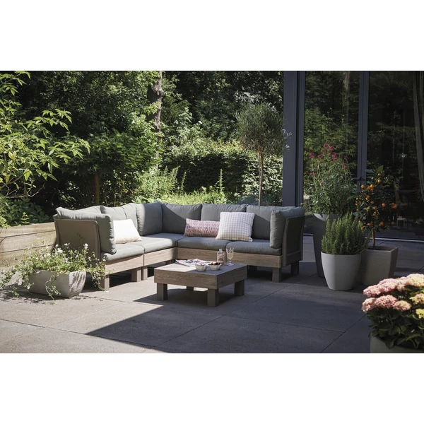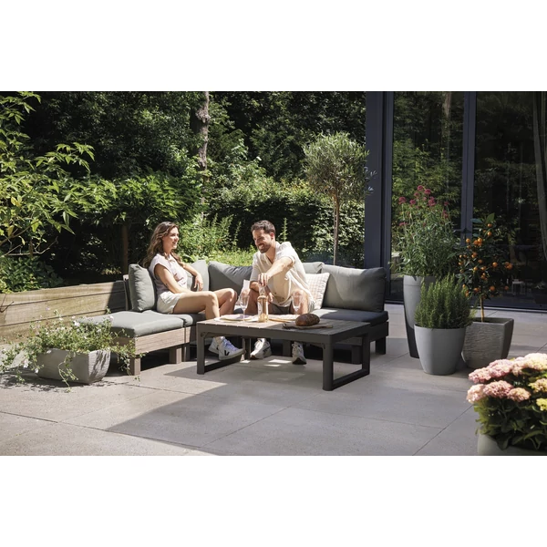 A szett ellenáll a kedvezőtlen időjárási körülményeknek és az UV-sugárzásnak, és nagyon könnyen tisztán tartható. A dió/mohazöld színkombináció meleg, természetes megjelenést kölcsönöz, amely harmonikusan illeszkedik a zöld környezetbe.