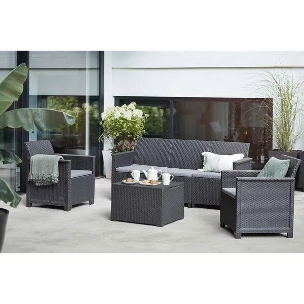 Alakítsd át a teraszod, az erkélyed vagy a kerted a Keter kényelmes Elodie Lounge foteleivel. A fotelekhez tartozó párnák szenzációs kényelmet biztosítanak a kikapcsolódáshoz. Az Elodie termékcsalád bútorainak tervezése során fő szempont volt a kényelem, így biztosan tökéletes választás lesz bármely kertbe. A bútorok fenntartható, időjárásálló és karbantartást nem igénylő anyagokból készültek. Kombináld ezt a háromszemélyes kanapét további Elodie fotelekkel és egy asztallal a saját ülőgarnitúrád megalkotásához!