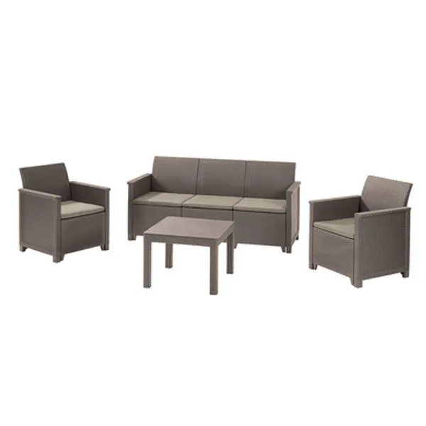 Az Elodie szett minden helyzetben jó megoldás. A segítségével berendezheted álmaid kertjét, teraszát, még akkor is, ha nem rendelkezel sok hellyel. A nádfonásos és sima könyöklők, valamint a rezolit asztallap kihangsúlyozzák a szett egyedi jellegét. Az egyedi szerkezet lehetővé teszi a választást két különböző kombináció között az összeszerelés elkezdése előtt. Az egyetlen csomagban megtalálható minden elem egy háromszemélyes kanapé, két fotel és egy klasszikus Chicago asztal összeszereéséhez, de az elemekből összeállítható egy két kanapés, egy foteles és egy asztalos verzió is. A bútorok könnyen tisztíthatók, valamint gyorsan és egyszerűen összeszerelhetők a “just click and go” kialakításnak köszönhetően. A készlethez polietilén-pamut párnák is tartoznak.