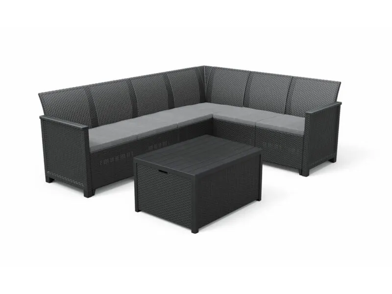 Az Elodie 6 személyes sarokgarnitúra szett tároló asztallal a lehető legnagyobb precizitással készült. A szett egy 6 személyes, maximális kényelmet nyújtó sarokkanapéból és egy stílusos dohányzóasztalból áll. A könnyű, de stabil bútorok kiváló minőségű, a kedvezőtlen időjárási viszonyoknak ellenálló anyagból készülnek. A bútorok fő előnyeit az eredeti rattan szerkezetű felület és a kanapé kényelmes profilú ülőrészei valamint a puha polipamut párnák adják. A szett könnyen tisztán tartható, UV sugárzás elleni védelemmel ellátott. A bútorok gyorsan és egyszerűen összeszerelhetők a “just click and go” kialakításnak köszönhetően