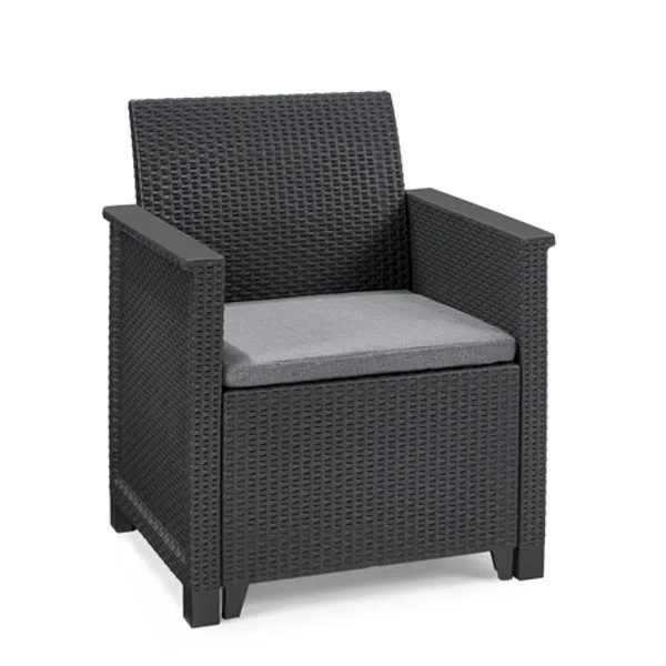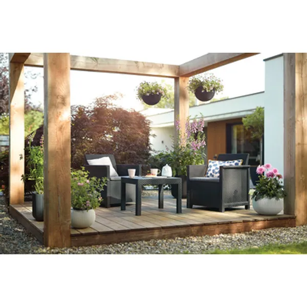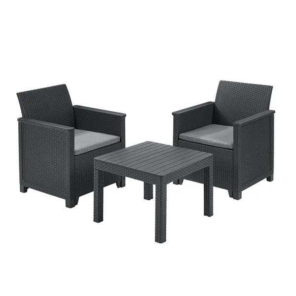 Az Elodie Balcony szett minden helyzetben jó megoldás. A segítségével berendezheted álmaid kertjét, teraszát, még akkor is ha nem nagy a rendelkezésre álló hely. A szett 2 fotelt és egy klasszikus Chicago asztalt tartalmaz. A nádfonásos és sima könyöklők valamint a rezolit asztallap kihangsúlyozzák a szett egyedi jellegét. A bútorok könnyen tisztíthatók, valamint gyorsan és egyszerűen összeszerelhetők a “just click and go” kialakításnak köszönhetően. A készlethez polietilén-pamut párnák is tartoznak.