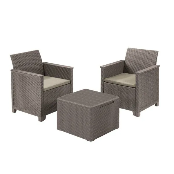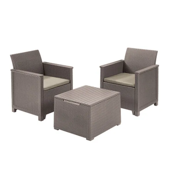 Az Elodie Balcony szett minden helyzetben jó megoldás. A segítségével berendezheted álmaid kertjét, teraszát, még akkor is ha nem nagy a rendelkezésre álló hely. A szett 2 fotelt és egy párnatartónak is használható asztalt tartalmaz. A nádfonásos és sima könyöklők valamint a rezolit asztallap kihangsúlyozzák a szett egyedi jellegét. A bútorok könnyen tisztíthatók, valamint gyorsan és egyszerűen összeszerelhetők a “just click and go” kialakításnak köszönhetően. A készlethez polietilén-pamut párnák is tartoznak.