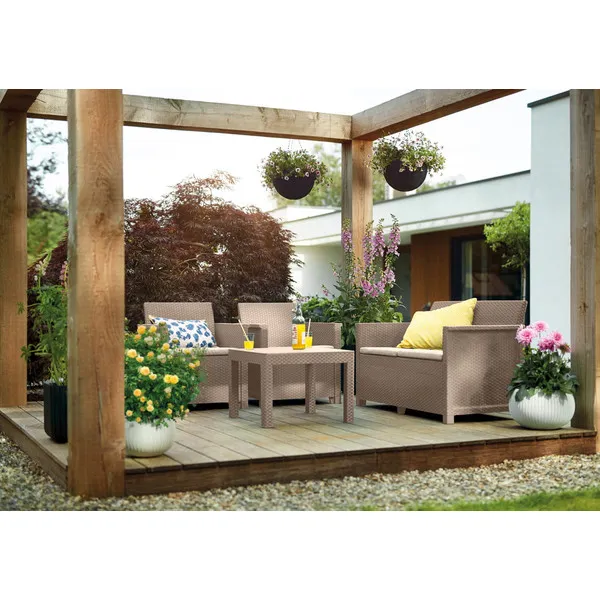 Az Elodie szett minden helyzetben jó megoldás. A segítségével berendezheted álmaid kertjét, teraszát, még akkor is ha nem nagy a rendelkezésre álló hely. A szett 2 fotelt, egy kétszeméyles kanapét és egy klasszikus Chicago asztalt tartalmaz. A nádfonásos és sima könyöklők valamint a rezolit asztallap kihangsúlyozzák a szett egyedi jellegét. A bútorok könnyen tisztíthatók, valamint gyorsan és egyszerűen összeszerelhetők a “just click and go” kialakításnak köszönhetően. A készlethez polietilén-pamut párnák is tartoznak.