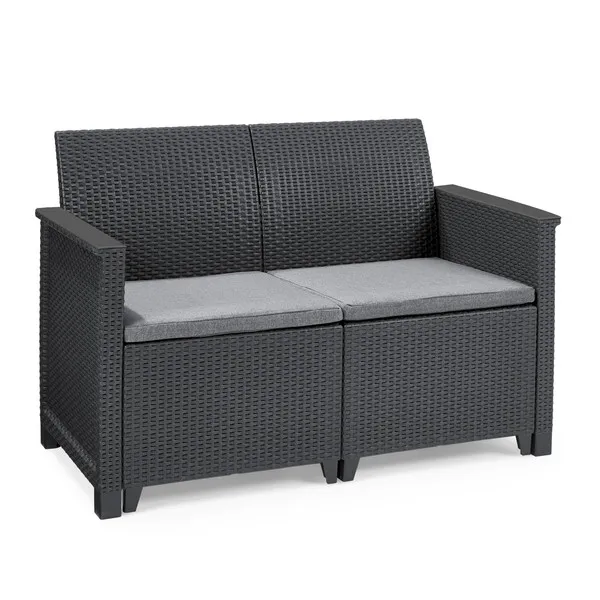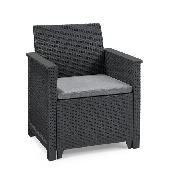 Az Elodie szett minden helyzetben jó megoldás. A segítségével berendezheted álmaid kertjét, teraszát, még akkor is ha nem nagy a rendelkezésre álló hely. A szett 2 fotelt, egy kétszeméyles kanapét és egy klasszikus Chicago asztalt tartalmaz. A nádfonásos és sima könyöklők valamint a rezolit asztallap kihangsúlyozzák a szett egyedi jellegét. A bútorok könnyen tisztíthatók, valamint gyorsan és egyszerűen összeszerelhetők a “just click and go” kialakításnak köszönhetően. A készlethez polietilén-pamut párnák is tartoznak.