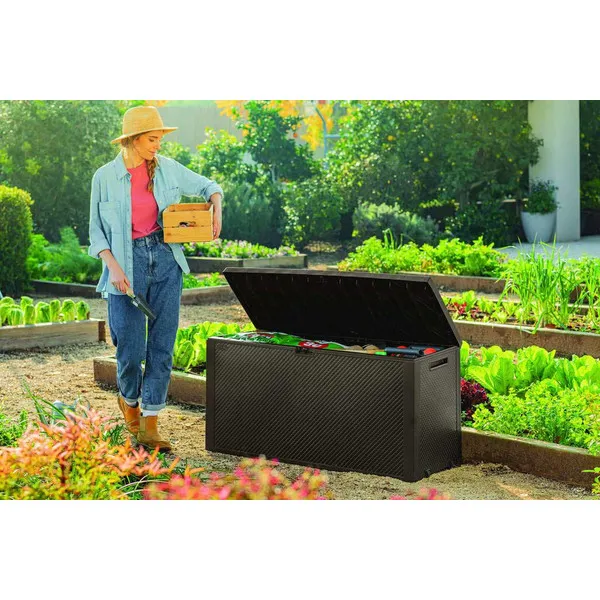 Az egyszerű forma, valamint a könnyű és gyors összeszerelés a legnagyobb előnye az univerzális, 270L-es Emily kerti tároló ládának. A ládát különféle kerti eszközök és kiegészítők, párnák és gyermekjátékok tárolására tervezték. A láda modern stílusa és klasszikus színkompozíciója lehetővé teszi, hogy a láda passzoljon bármilyen kerti dekorációhoz. Tökéletesen kiegészíti az Emily termékcsalád kerti bútor szettjeit. Ideális megoldás lehet a teraszra vagy a kertbe.