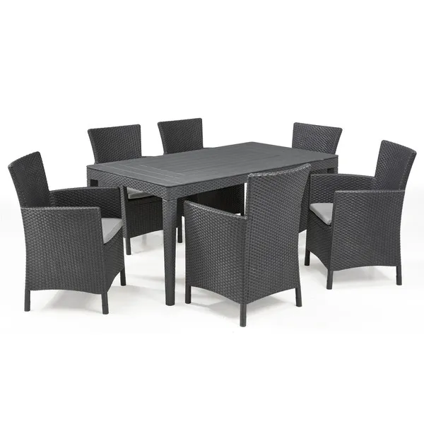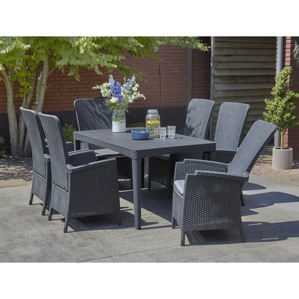 A Girona asztalcsalád azoknak fogja elnyerni a tetszését, akik értékelik a természetes rattanra emlékeztető, lekerekített vagy lapos szövésű mintával díszített bútorok stílusát és eleganciáját. Az asztalt rendkívül könnyű összeszerelni és tisztán tartani. A termék ellenáll a kölső hatások okozta sérüléseknek, a kedvezőtlen időjárási körülmények és az UV-sugarak hosszú távú hatásainak is.